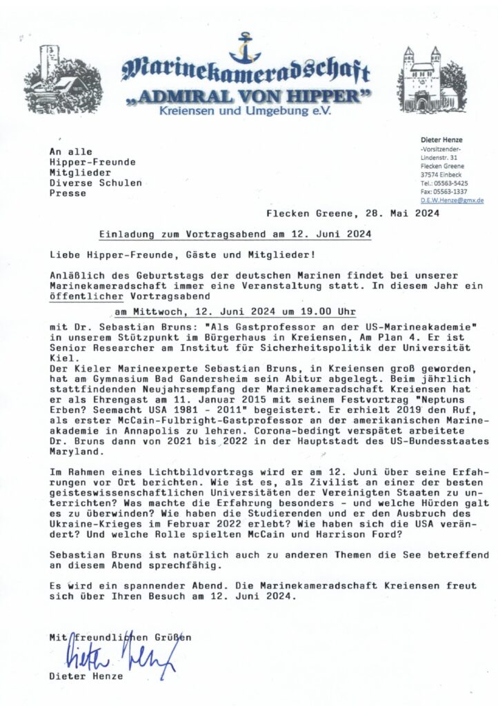 Einladung zum Vortragsabend der Marinekameradschaft „Admiral von Hipper“ Kreiensen und Umgebung e.V.